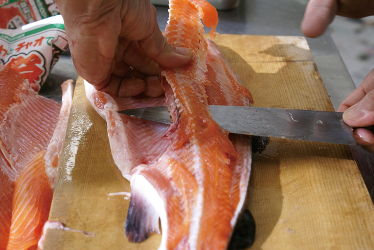 まず初めにアルプスサーモンの棚田養魚場を見学します。その後、そこで育ったアルプスサーモンを使った料理方法を伝授。